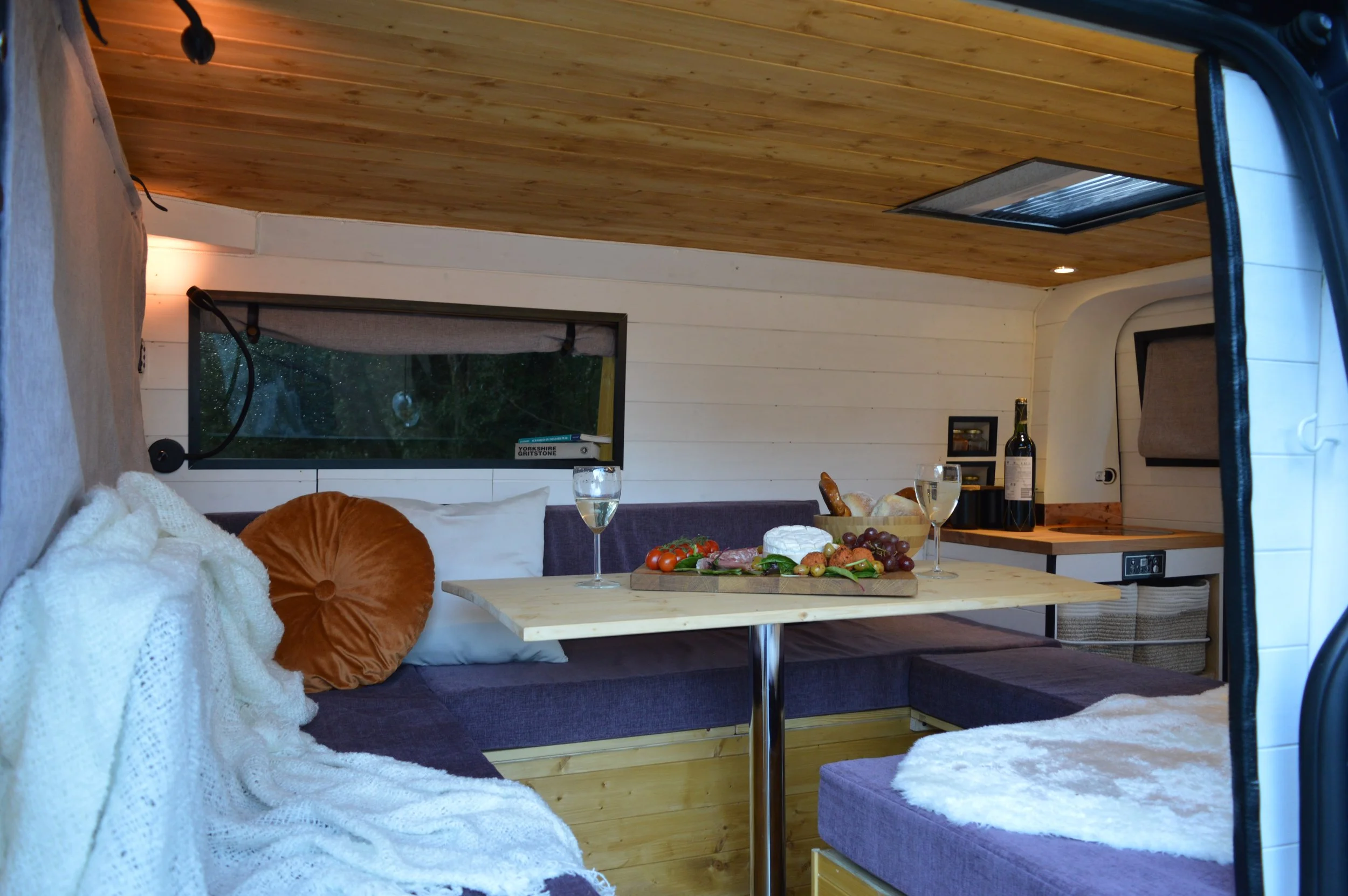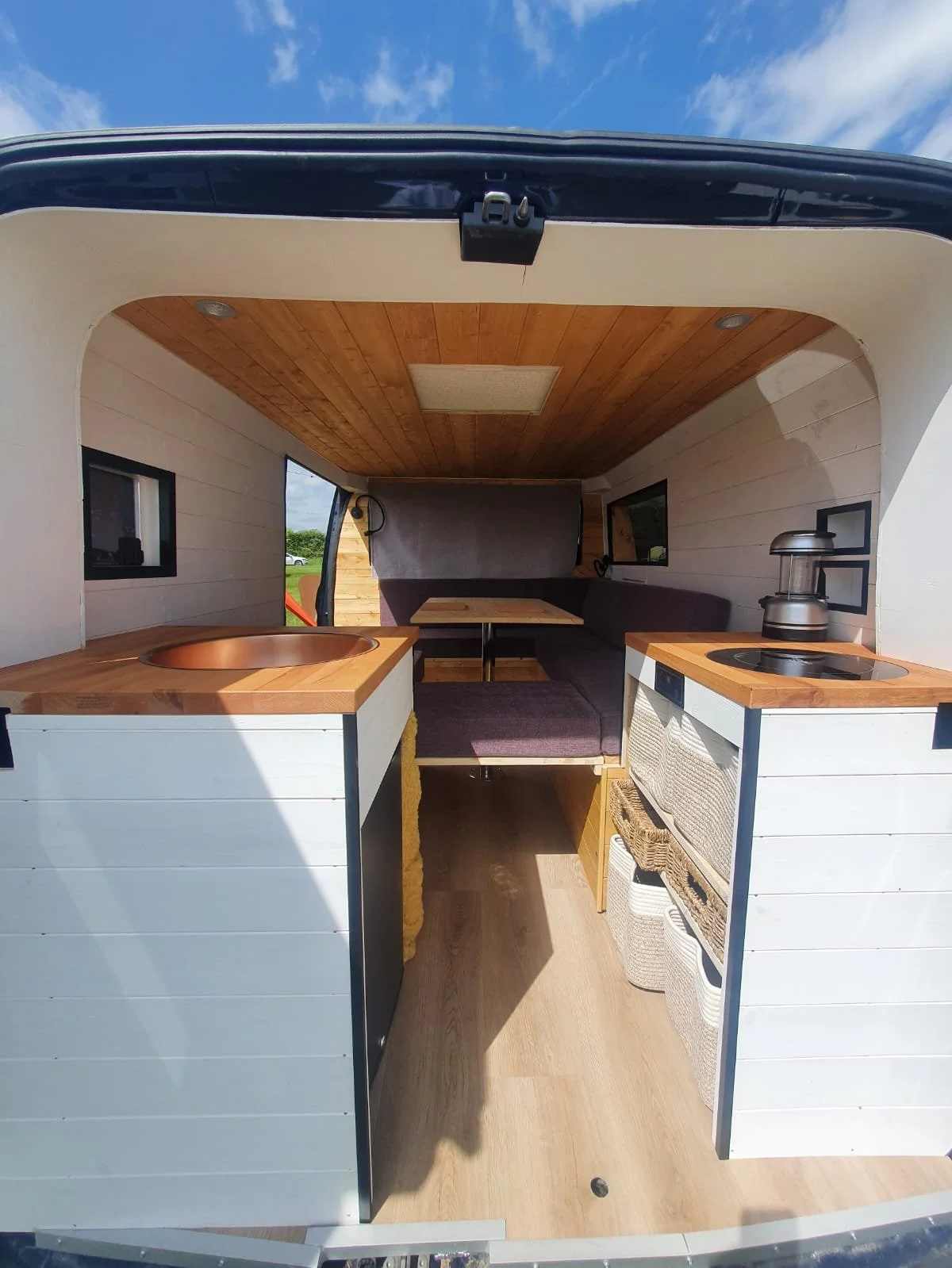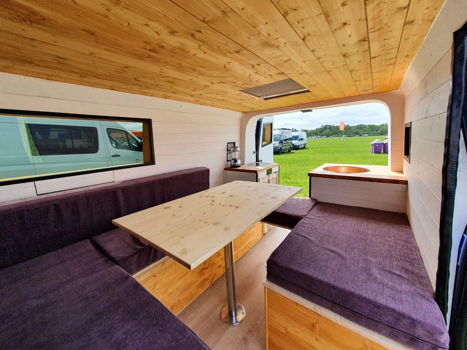 Luna is based on a short wheel base Transit Custom, and features U shaped seating around a table, and an extra large king sized bed, as well as a rear kitchen, allowing you to cook inside or out!