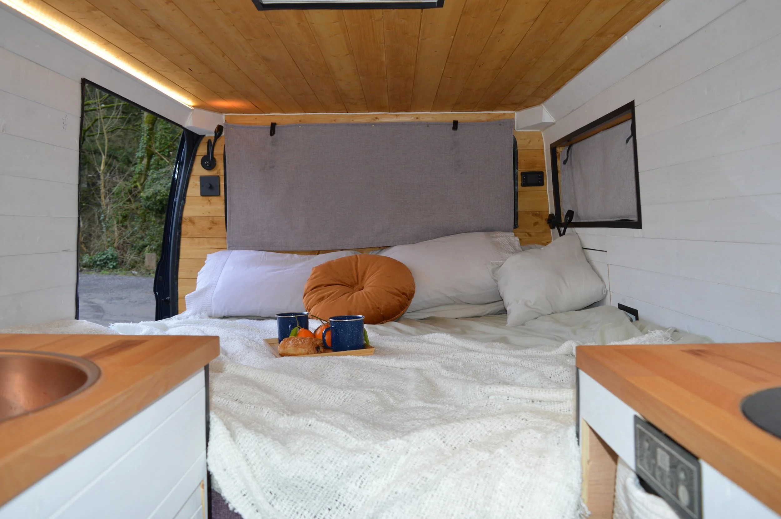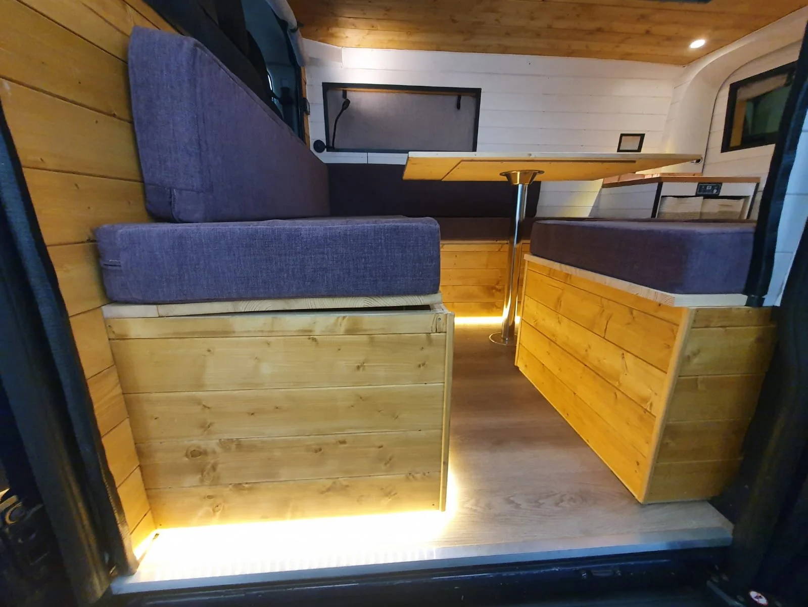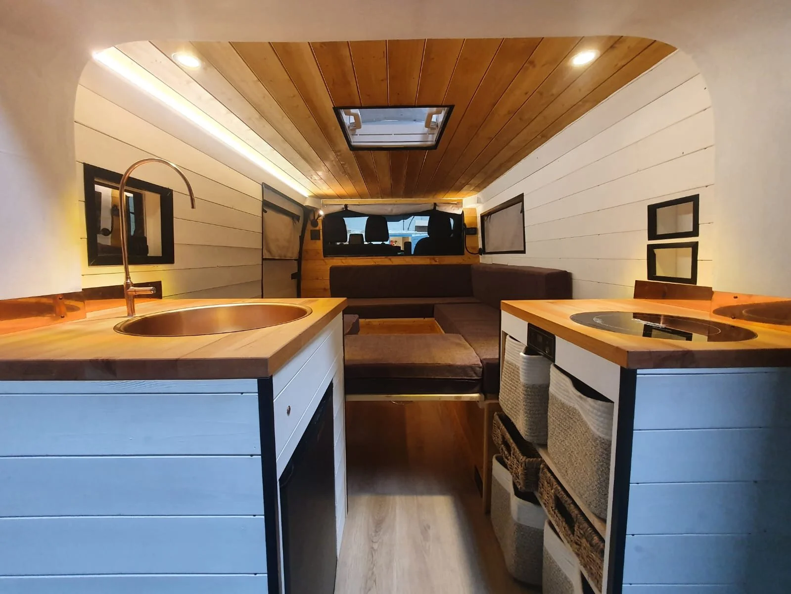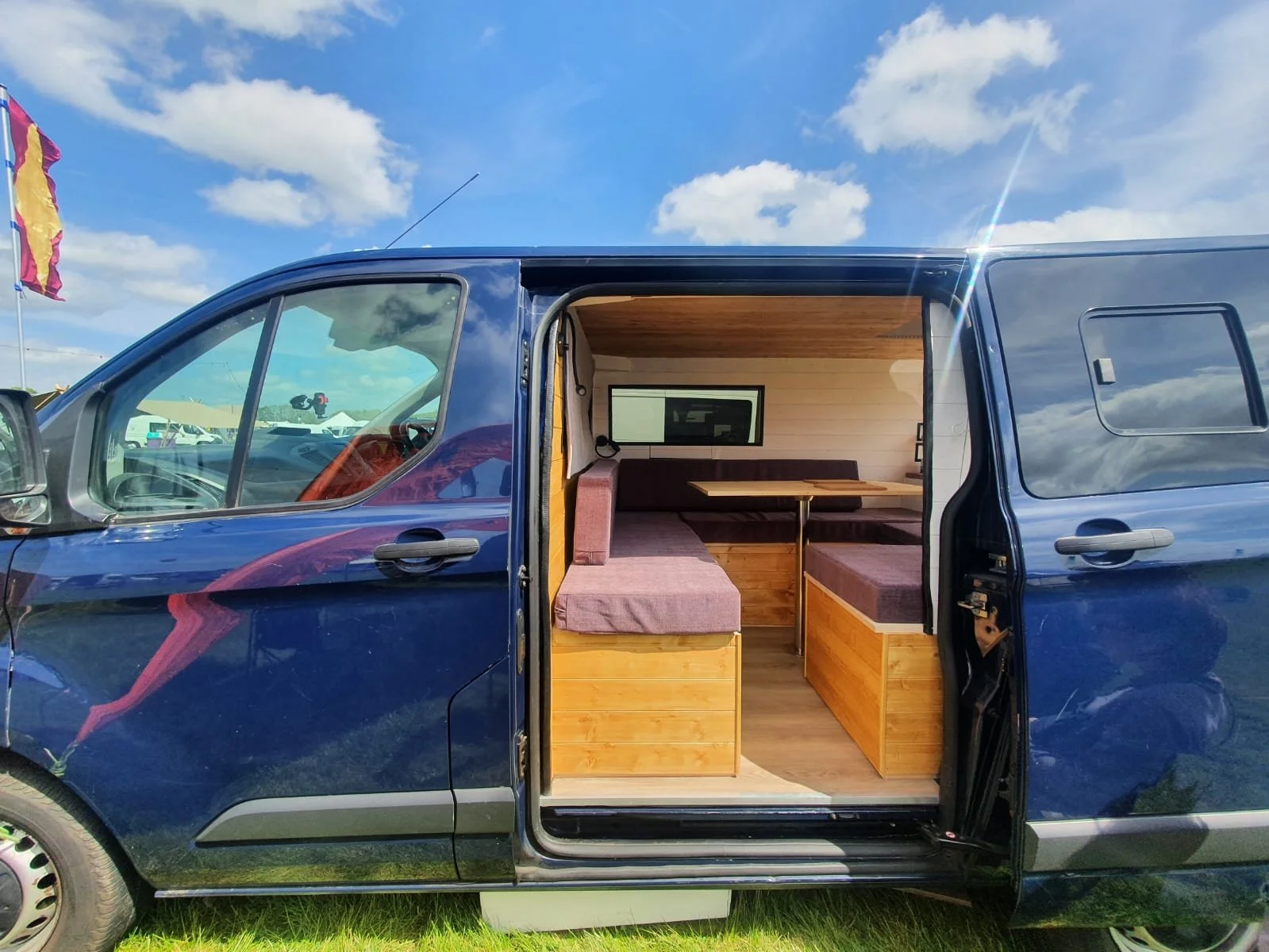 Luna is based on a short wheel base Transit Custom, and features U shaped seating around a table, and an extra large king sized bed, as well as a rear kitchen, allowing you to cook inside or out!