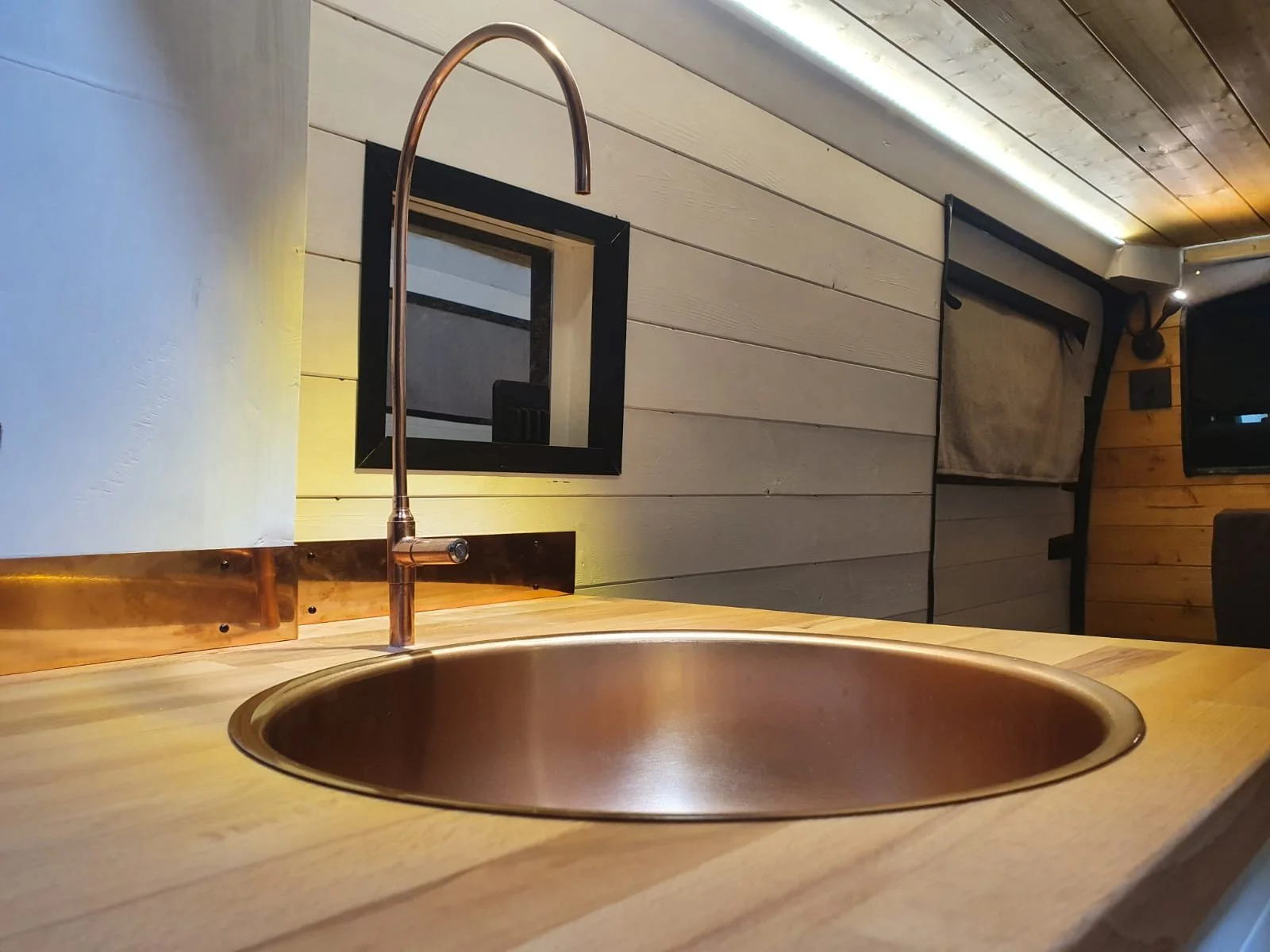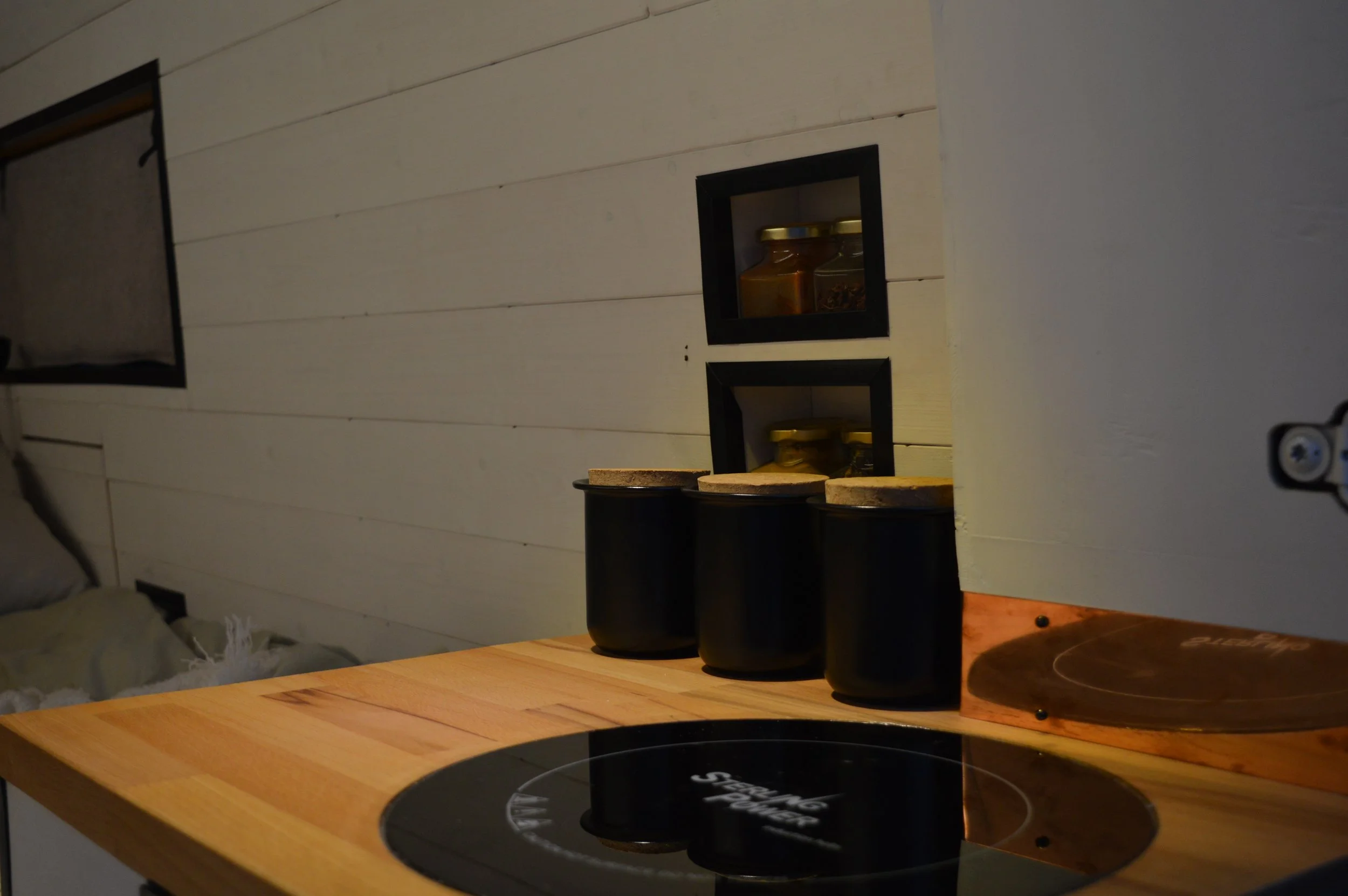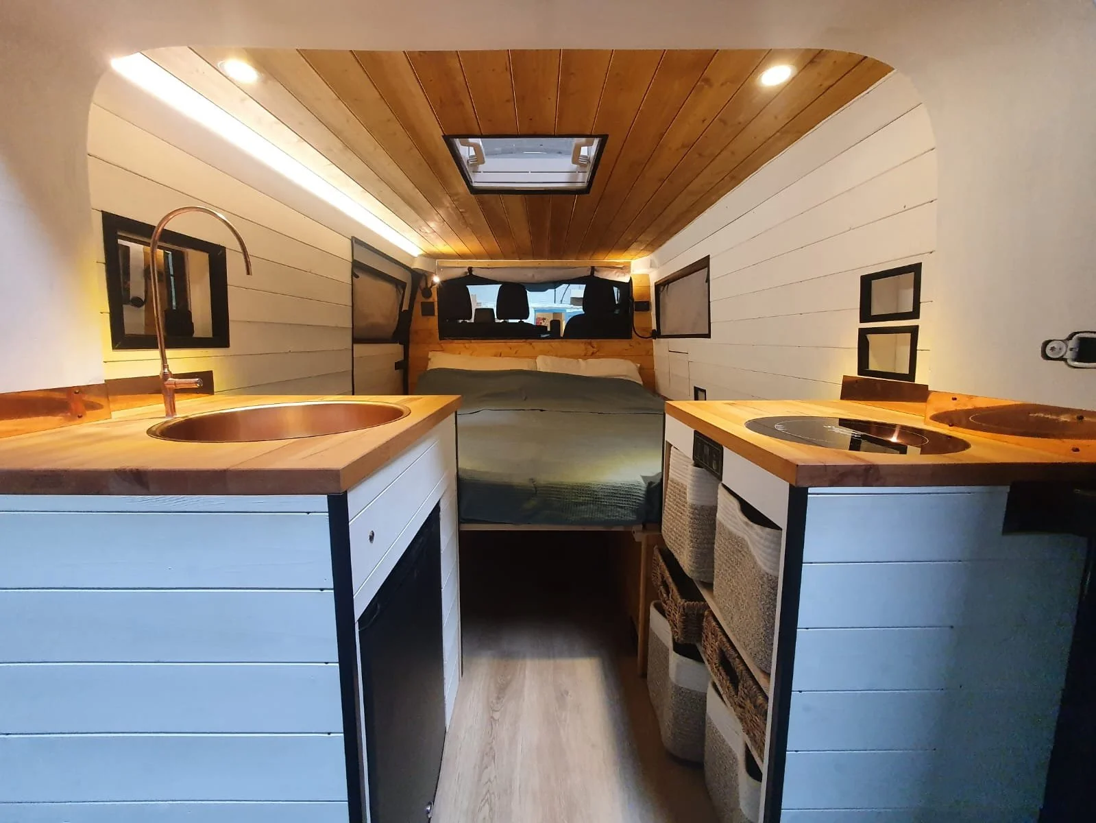 She was our first completely off-grid, gas free build, with a built in induction hob, and fridge in her compact kitchen.